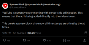 Der Werbeblocker SponsorBlock veröffentlicht die Nachrichten über das serverseitige Werbeexperiment von Google.