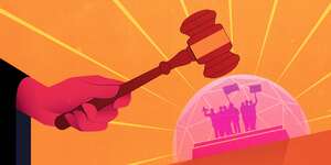 illustration of giant gavel hitting a small glass dome with protesters inside
